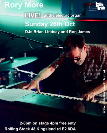 Back on the killer console! Stand by for electrified organ jazz and Sunday afternoon swingerama as Rory More sets the controls for groove central.