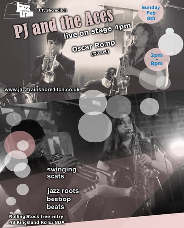 PJ and the Aces performing well-loved jazz standards, from Wayne Shorter to Art Blakey to Thelonious Monk, alongside reharmonisation and jazz twists on modern hits. The sound is classic and fun, ranging from boppy crowd pleasers to bebop to ballads.